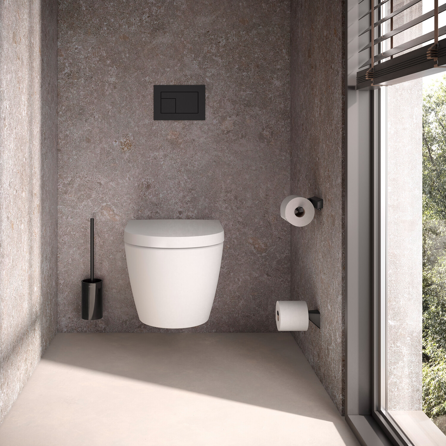 Der solide Toilettenpapierhalter ist mit einer Rollenbremse ausgestattet, damit wird das unkontrollierte Abrollen des Papiers verhindert. Die Toilettenbürstengarnitur wird ebenfalls an der Wand befestigt, sodass der Boden immer frei bleibt. Der hochwertige Bürstenbehälter aus Glas hat einen herausnehmbaren Einsatz und kann komfortabel gereinigt werden. Ein waagerechter Ersatzrollenhalter komplettiert das schicke Trio für den Einsatz am WC.