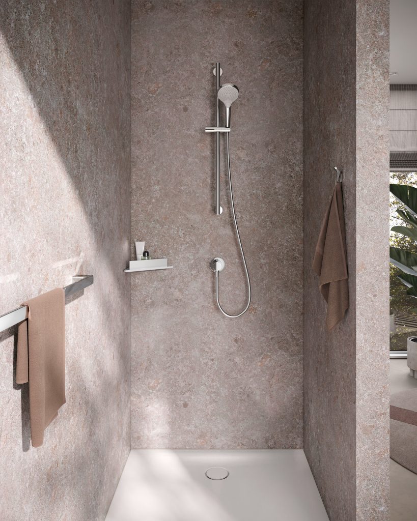 Auch beim Haltegriff zeigen sich die weichen Übergänge zwischen den geometrischen Elementen und den klar abgesetzten Konturen und erzeugen so eine sinnliche Harmonie. Da der Haltegriff besonderen Belastungen ausgesetzt ist, lässt er sich ausschließlich mit entsprechend beiliegenden Dübeln und Schrauben montieren. Eine Klebebefestigung ist daher beim Haltegriff nicht vorgesehen.